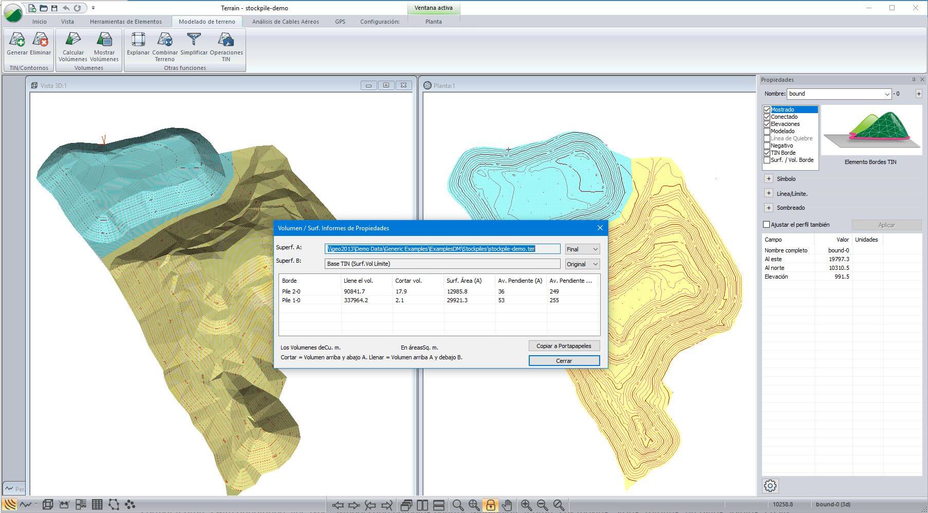Ideal para diseños tridimensionales de sitio, cálculo de volúmenes de pilas, levantamientos de minas, diseño de explanaciones y pozas, generación de superficies a partir de curvas de nivel y diseño de vertederos.