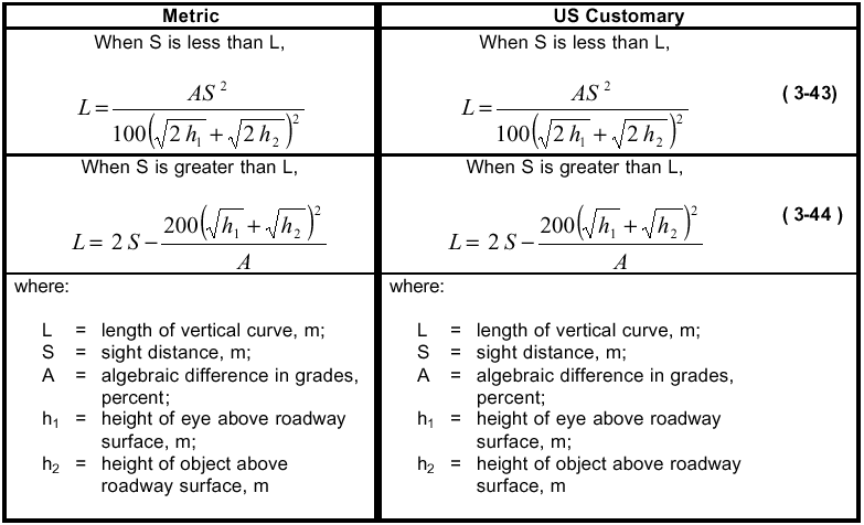 If checked, the Length and K factor are automatically calculated to provide the Sight Distance specified (see below). AASHTO 2001 exhibit 3-74, S<L equation: