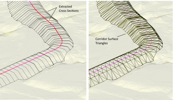 Corridor surfaces are TIN surfaces created automatically during the processing of a horizontal alignment.