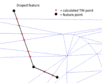Features that are entered without elevations (elevation check box off) are referred to as Draped features. If no DTM exists when a Draped feature is created the elevation of each point is undefined (set to -9999). If a DTM exists, the elevation is determined from the model. In addition, triangle intersection points (TIN points) are calculated as illustrated below.