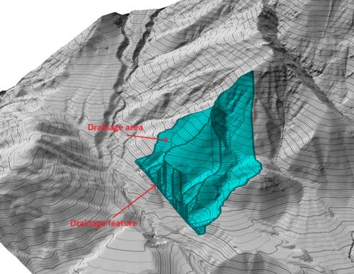 Here, one or more target drain features can be selected. The tool will compute drainage areas towards all selected features simultaneously. For each selected feature, an independent set of drainage areas will be created, that is, the drainage areas of different features do not become merged. The feature corresponding to each drainage area is indicated in its name.