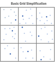 There are four methods of thinning (simplification). The first three use a Sample Grid; you can control the grid size with the Spacing field. Note that there is a limit to the number of Cells allowed; you will be warned if you exceed this limit. These methods produce more evenly spaced points than the import thinning options .