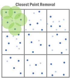 This thinning method uses a Horizontal minimum distance in addition to the Sample Grid Spacing. Multiple points per grid cell can be retained if they are further apart than the minimum distance. Points close to other points (less than the minimum distance), will be discarded. This method is often slower than Basic Grid Simplification but it uses larger (and therefore fewer) grid cells to give similar resolution.